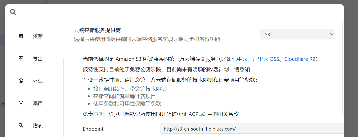 3.使用第三方同步,我目前用的就是七牛云的免费永久10g空间。实测很好用同步没任何问题,10g要是不够扩容也挺便宜,毕竟官方才8g,但是需要注意的是流量是要按3毛/1GB收费的,每个月需要几块钱,实测cloudflare R2的免费额度基本是够个人用的速度也不错。